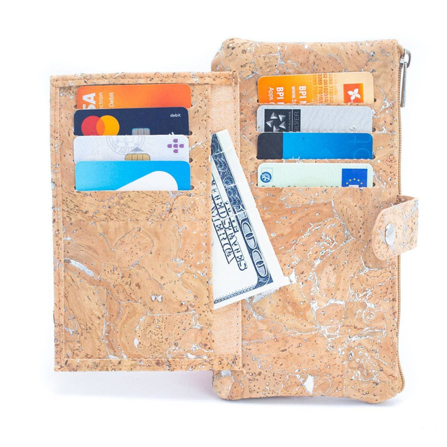 Portefeuille en liège disposant de 8 emplacements pour cartes, d'une poche pour les billets et d'une poche principale zippée. Organisez tous vos essentiels de manière compacte.